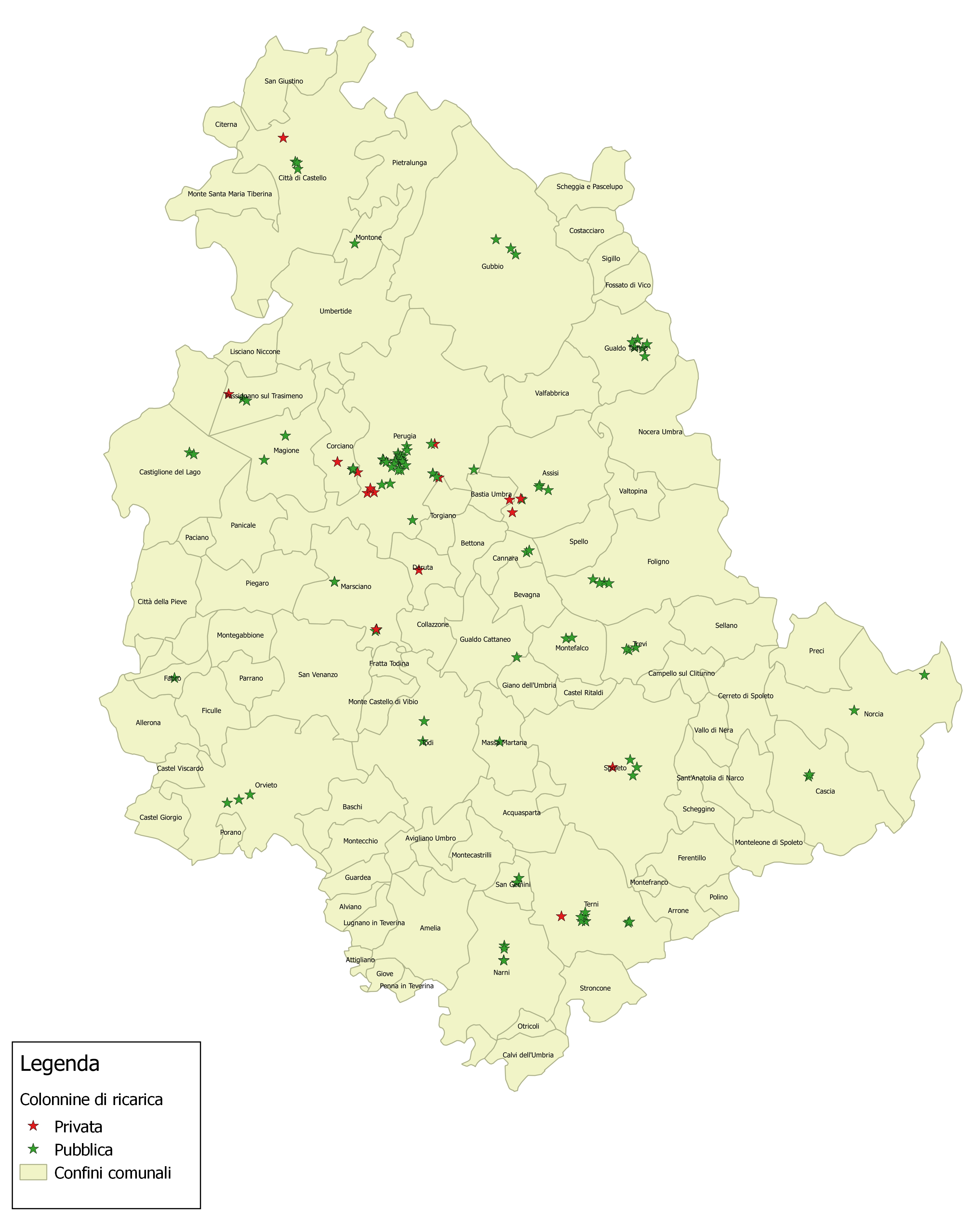 Nella Regione Umbria sono attualmente installate colonnine di ricarica in ben 27 Comuni.