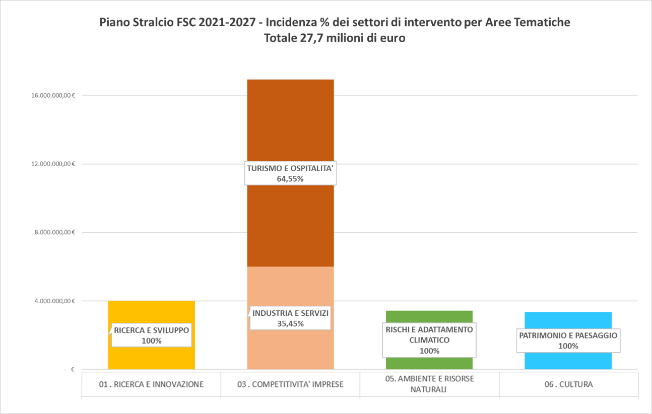 Il 75,5% della dotazione è destinata a interventi, più prontamente cantierabili, a supporto delle PMI, che svolgono attività ricettiva o appartenenti al settore dello spettacolo dal vivo/culturale-creativo/audiovisivo nonché per progetti finalizzati alla ricerca/sviluppo e a investimenti di carattere innovativo.