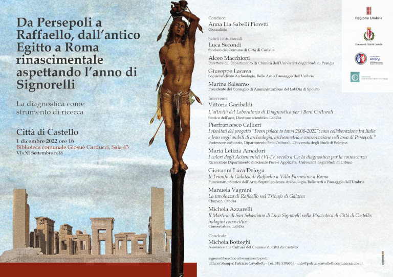 Giovedì 1 dicembre 2022 alle ore 16:00, a Città di Castello presso la Biblioteca comunale "Giosuè Carducci" (Sala 43) si terrà l'incontro "Da Persepoli a Raffaello, dall’antica Persia a Roma rinascimentale aspettando l'anno di Signorelli. La diagnostica come strumento di ricerca".