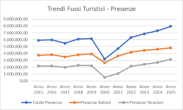 con un incremento del +6.8% negli arrivi e +7% nelle presenze rispetto al 2024, determinati da un incremento degli stranieri (+26.9% arrivi e +24.00% presenze) e un decremento degli italiani (-1,1% arrivi e -0,4% presenze).