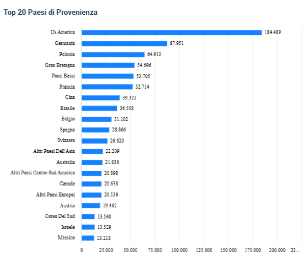 Nei grafici seguenti è indicata la Top20 degli Stati esteri di residenza da cui sono arrivati i turisti stranieri nell’Anno 2025 e la Top20 dei comuni umbri di destinazione degli stranieri