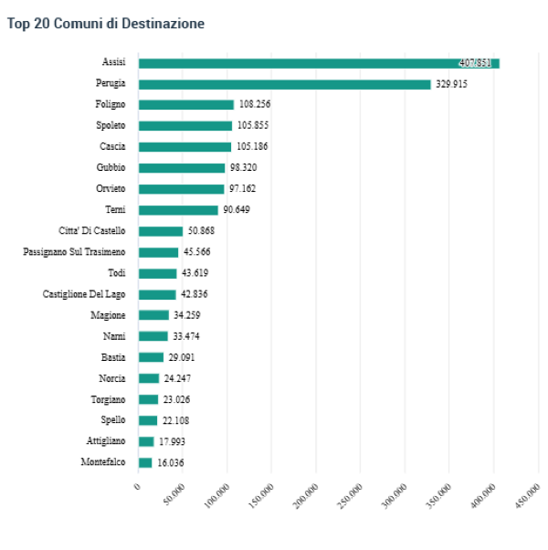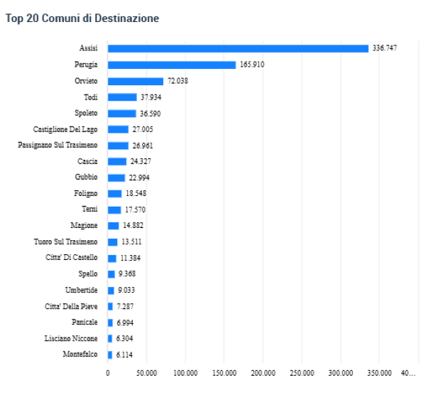 Nei grafici seguenti è indicata la Top20 delle province di residenza da cui sono arrivati i turisti italiani nell’Anno 2025 e la Top20 dei comuni umbri di destinazione degli italiani