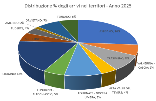 Nel 2025, il 43.35% dei turisti arrivati in Umbria ha scelto di soggiornare in strutture extralberghiere; di questi, il 67.48% sono italiani e il 32.52% sono stranieri.