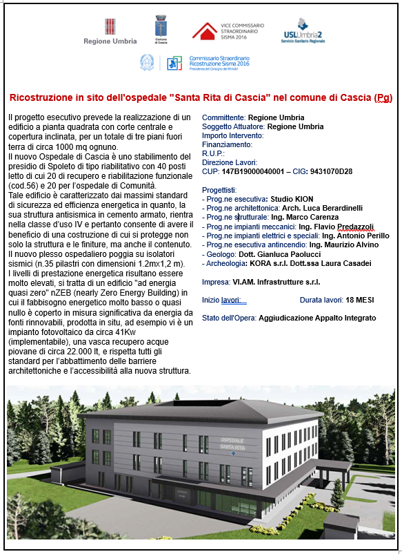Il nuovo Ospedale di Cascia è uno stabilimento del presidio di Spoleto di tipo riabilitativo con 40 posti letto di cui 20 di recupero e riabilitazione funzionale (cod.56) e 20 per l’ospedale di Comunità.