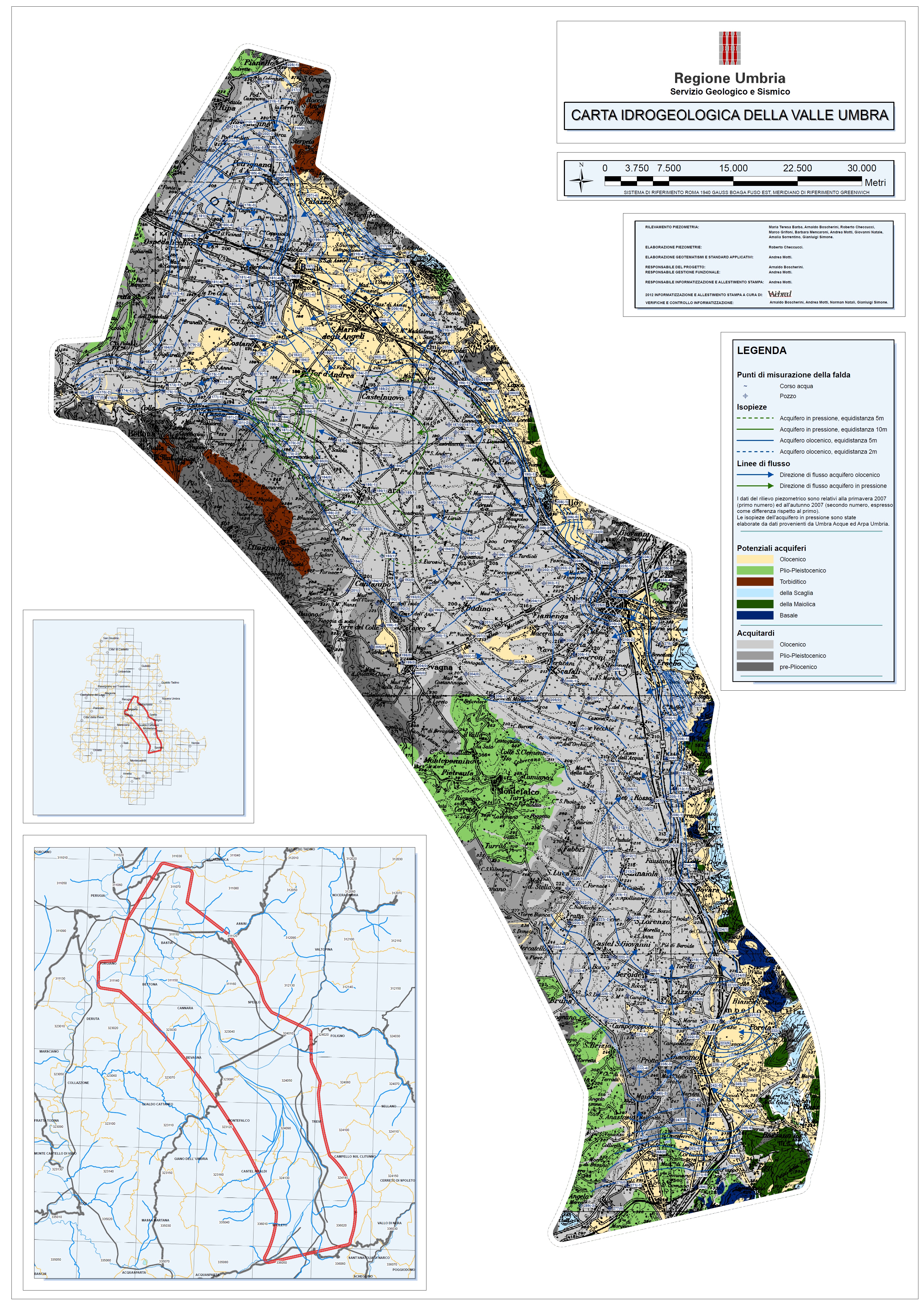 Il Servizio Geologico regionale, in seguito all'elaborazione dei dati ottenuti con la campagna di rilievi piezometrici svolti durante il 2007, ha realizzato la Carta Idrogeologica della Valle Umbra, in cui per l'area di studio vengono riportati: