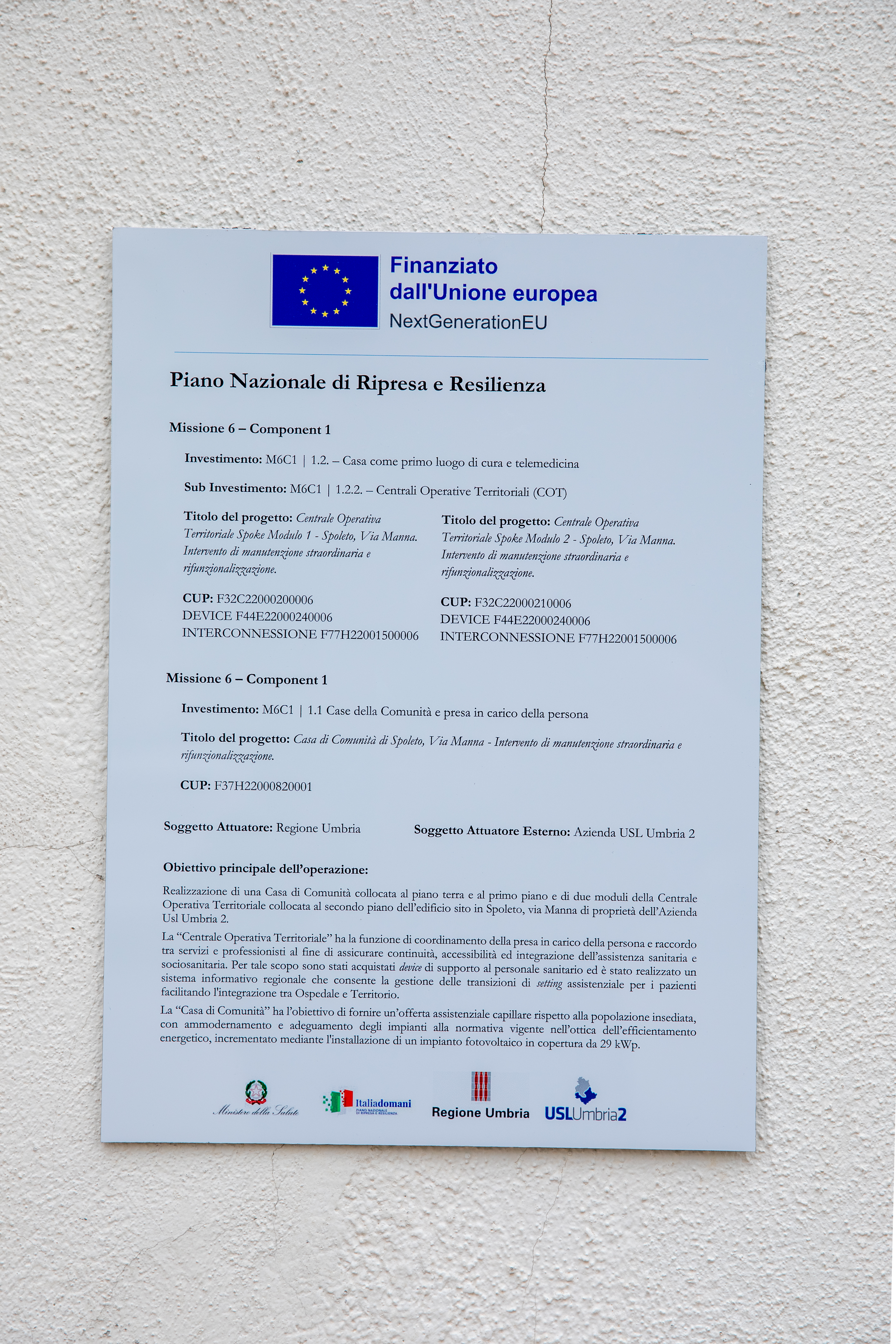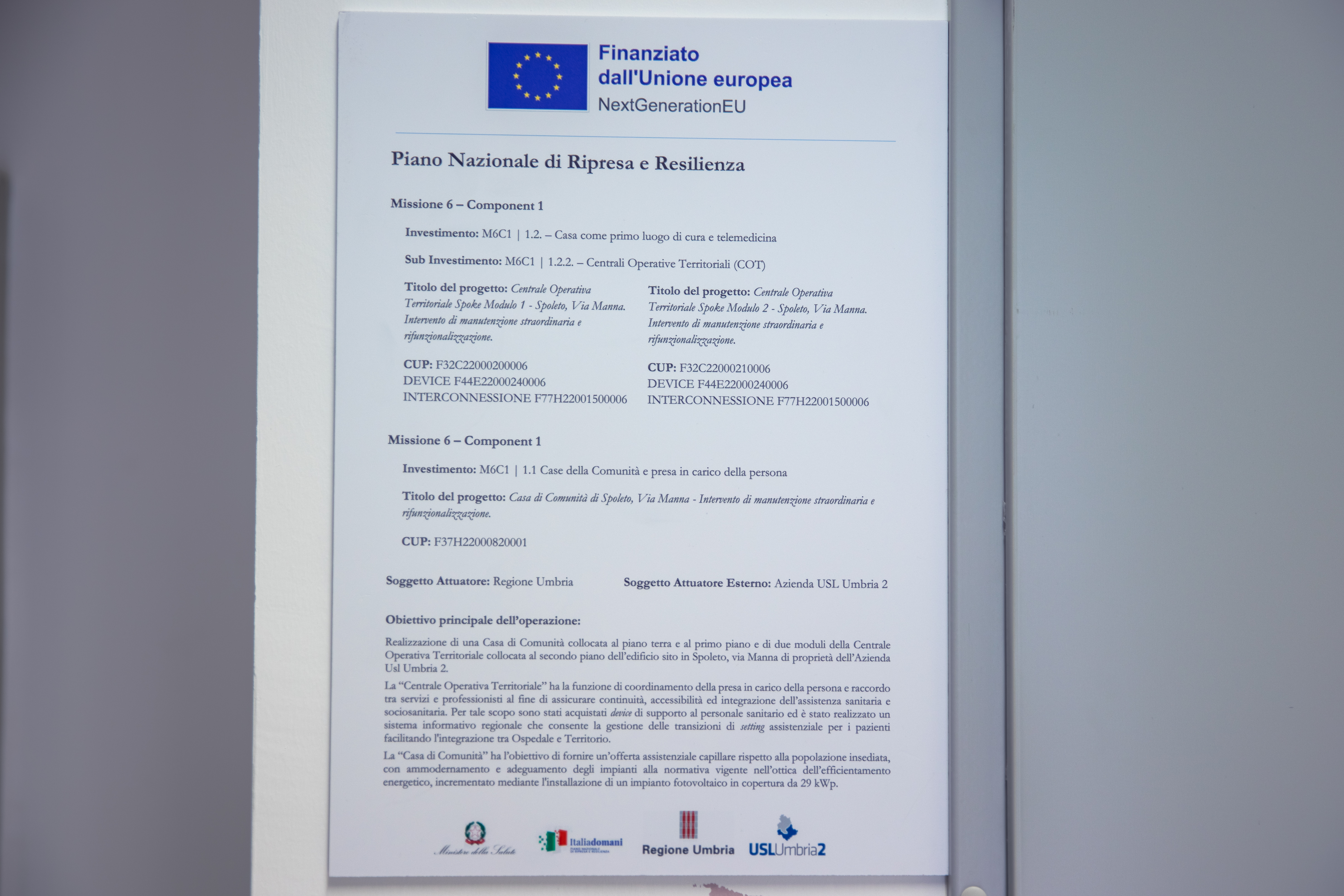 The intervention aims to establish a Territorial Operational Center, a structure that serves the function of coordinating the care of individuals and connecting services and professionals to ensure continuity, accessibility, and integration of healthcare and social-healthcare services. The decision has been made to place the Territorial Operational Center (COT) of Spoleto in the building located at Via Aldo Manna, 15, Spoleto (Spoke Module 1 – Spoke Module 2), which is already included in the investment plan of the PNRR for the creation of the "Community House." The selected building for the intervention possesses all the necessary characteristics to host this Service; it is also visible and easily accessible for the local community, and thanks to the significant investment planned, it will assume a primary role for territorial services. The Territorial Operational Center plays a key role in integrating hospital care and community services, facilitating continuity of care by coordinating and monitoring transitions from one care setting to another or from one clinical/support level to another, ensuring comprehensive care for the patient. Finally, it should be emphasized that concentrating the resources allocated for the Community House with those related to the COT into a single intervention will optimize costs and streamline the process, allowing for the development of a single project and the management of one construction site, while also enabling the achievement of milestones and targets set by the PNRR. The interventions related to the COT cover an area of 115.20 sqm for COT Spoke Module 1 and 165.50 sqm for COT Spoke Module 2. The total available area (1320 sqm) aligns with the space requirements for Territorial Operational Centers and Community Houses as specified in DM 77/2022.