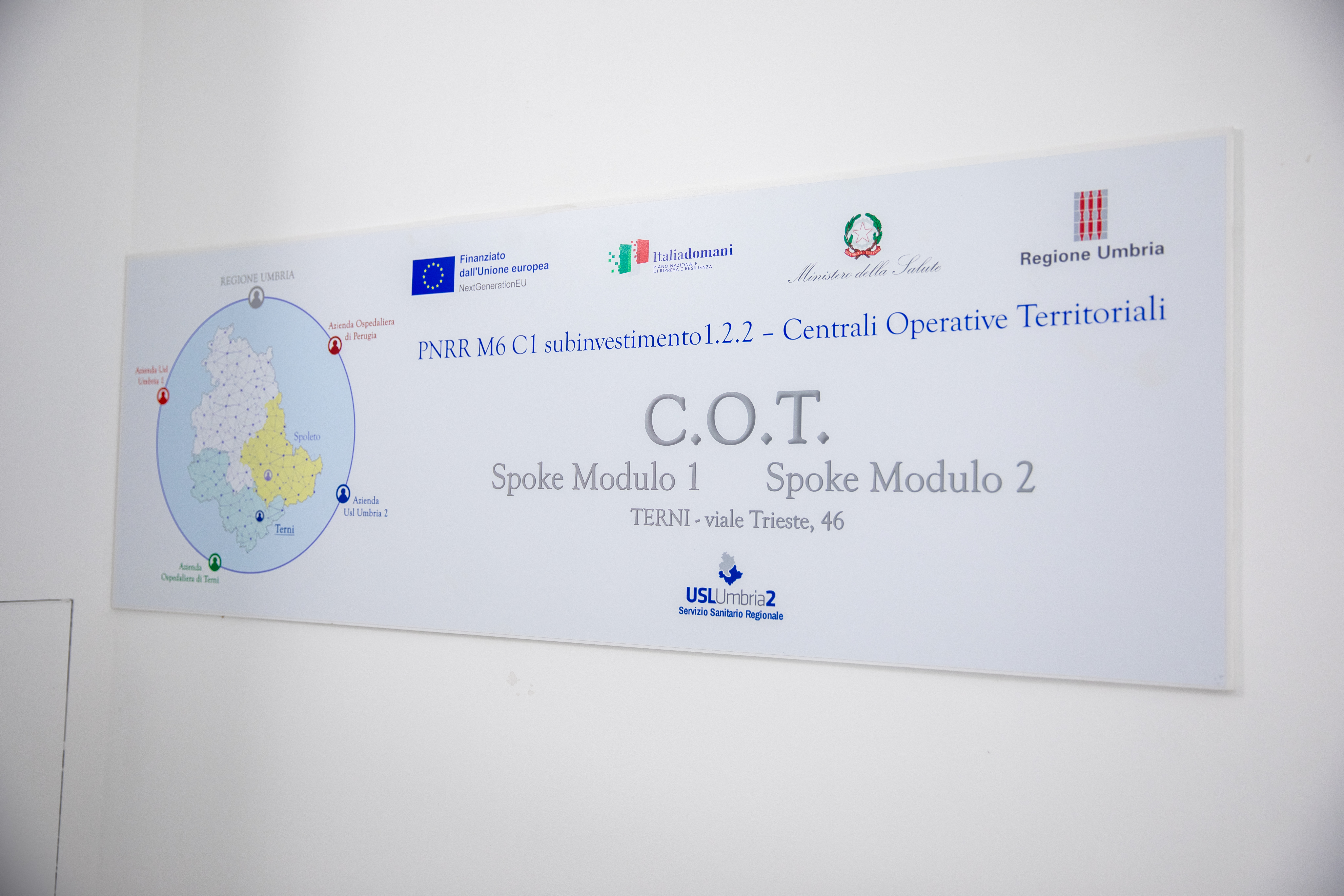 In particular, for the Terni District, the decision has been made to place the Territorial Operational Center (COT) in Terni, in the building located at Viale Trieste (Spoke Module 1, with an area of 99.86 sqm; Spoke Module 2, with an area of 88.98 sqm), which is already included in the investment plan of the PNRR for the establishment of the "Community House." The selected building for the intervention possesses all the necessary characteristics to host this Service; it is also visible and easily accessible for the local community, and thanks to the significant planned investment, it will assume a primary role in territorial services.