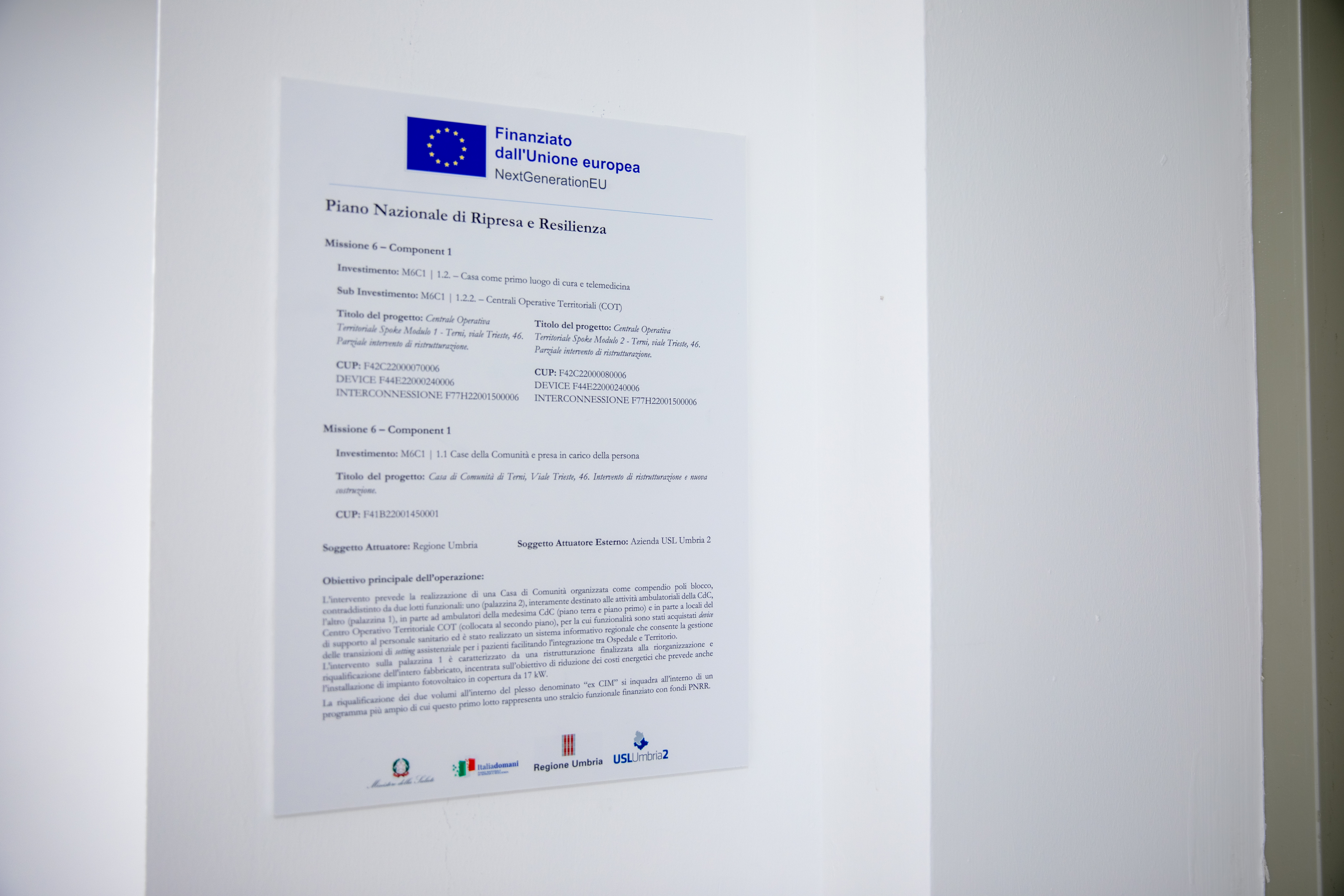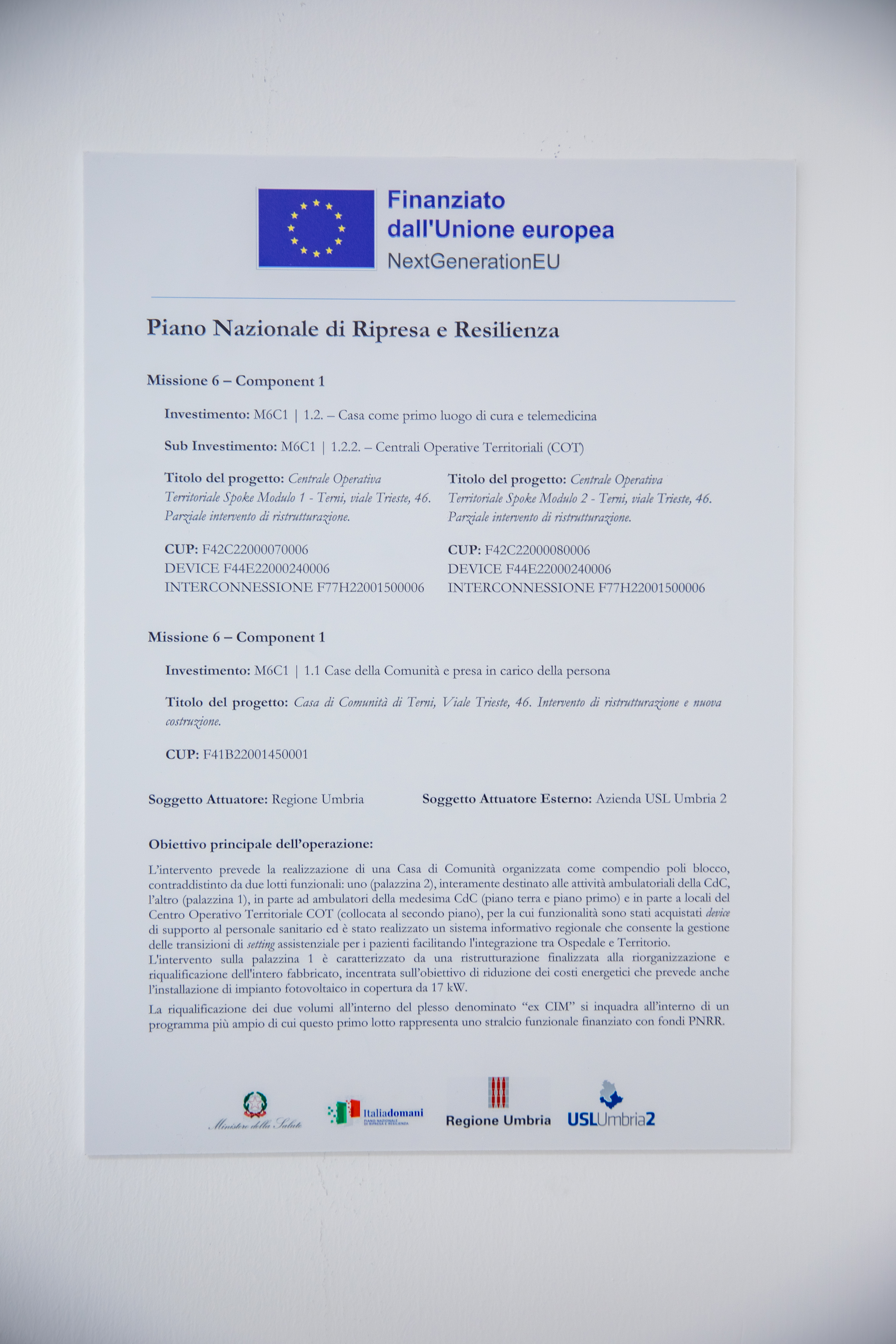 Realizzazione delle “Centrali Operative territoriali” (COT) a servizio del territorio di Terni. II progetto nasce dalla volontà di mettere a disposizione della comunità uno strumento organizzativo innovativo avente la funzione di coordinare i servizi domiciliari con gli altri servizi sanitari, assicurando l'interfaccia con gli Ospedali e con la rete di emergenza-urgenza. Le COT saranno dotate dei mezzi tecnologici per garantire il controllo remoto dei dispositivi di telemedicina forniti ai pazienti, sosterranno lo scambio di informazioni tra gli operatori sanitari coinvolti nella cura, costituiranno un punto di riferimento per i caregiver, sia per la formazione alla cura che per la sua attuazione, e fungeranno da punto di riferimento in caso di ulteriori necessita assistenziali del paziente, implementeranno un sistema che grazie all'ausilio dell'intelligenza artificiale e degli strumenti di machine learning, riuscirà a ridurre il numero di accessi di assistenza domiciliare degli operatori sanitari necessari per paziente senza ridurre la qualità di domiciliare degli operatori sanitari necessari per paziente senza ridurre la qualità di cura. In particolare, per il Distretto di Terni è stata fatta la scelta di inserire la Centrale Operativa Territoriale (Cot) a Terni, nell'edificio di Viale Trieste (Spoke Modulo 1, con superficie pari a 99.86 mq - Spoke Modulo 2, con superficie pari a 88.98 mq), sede peraltro ricompresa già nel piano di investimenti del PNRR per realizzare la "Casa della Comunità". L'edificio scelto per l'intervento, risulta infatti avere tutte le caratteristiche necessarie al fine di accogliere tale Servizio, è peraltro visibile e facilmente accessibile per la comunità di riferimento e grazie all'importante investimento previsto assumerà un ruolo primario per ii servizio territoriale.